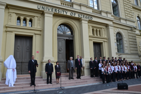 Szabó Gábor úgy kezdte: Szeged régóta tartozik magának azzal, hogy ilyetén módon állít emléket Szent-Györgyi Albertnek. Utalt rá, a Nobel-díjas tudós páratlan teljesítménye nem önmagában áll. – Felsejlik mögötte a legendás oktatáspolitikus, Klebelsberg Kuno alakja, aki rengeteget tett az egyetem idetelepítéséért, illetve Szeged lakossága, mely emberfeletti áldozatokat hozott az ügyben, végezetül a bölcsesség, mely Klebelsbergnek utat mutatott: az universitas nemcsak kövekből áll, hanem olyan szellemi nagyságokkal is meg kell tölteni, mint a külföldről hazahívott Szent-Györgyi – mondta a rektor, hozzáfűzve: nem véletlen, hogy Szent-Györgyi is hálával tekintett Klebelsbergre, a Nobel-díj átvétele után első szegedi útja a dómba vezetett, ahol a kultuszminiszter síremlékénél rótta le tiszteletét. – Akkor lenne teljes a kép itt a Dugonics téren, ha a hazainduló Szent-Györgyinek szemből Klebelsberg integetne – fogalmazta meg a következő időszak egyik feladatát.