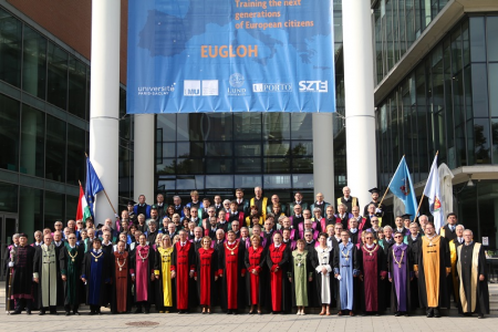 Ám az SZTE 2019-2020. tanévében aktív professzori karról a csoportkép most – a korábbi szokásoktól eltérően nem a Dugonics téren, hanem – a talárba öltözött egyetemi oktatók zászlós menetének megérkezése után, az SZTE TIK előtt készült.