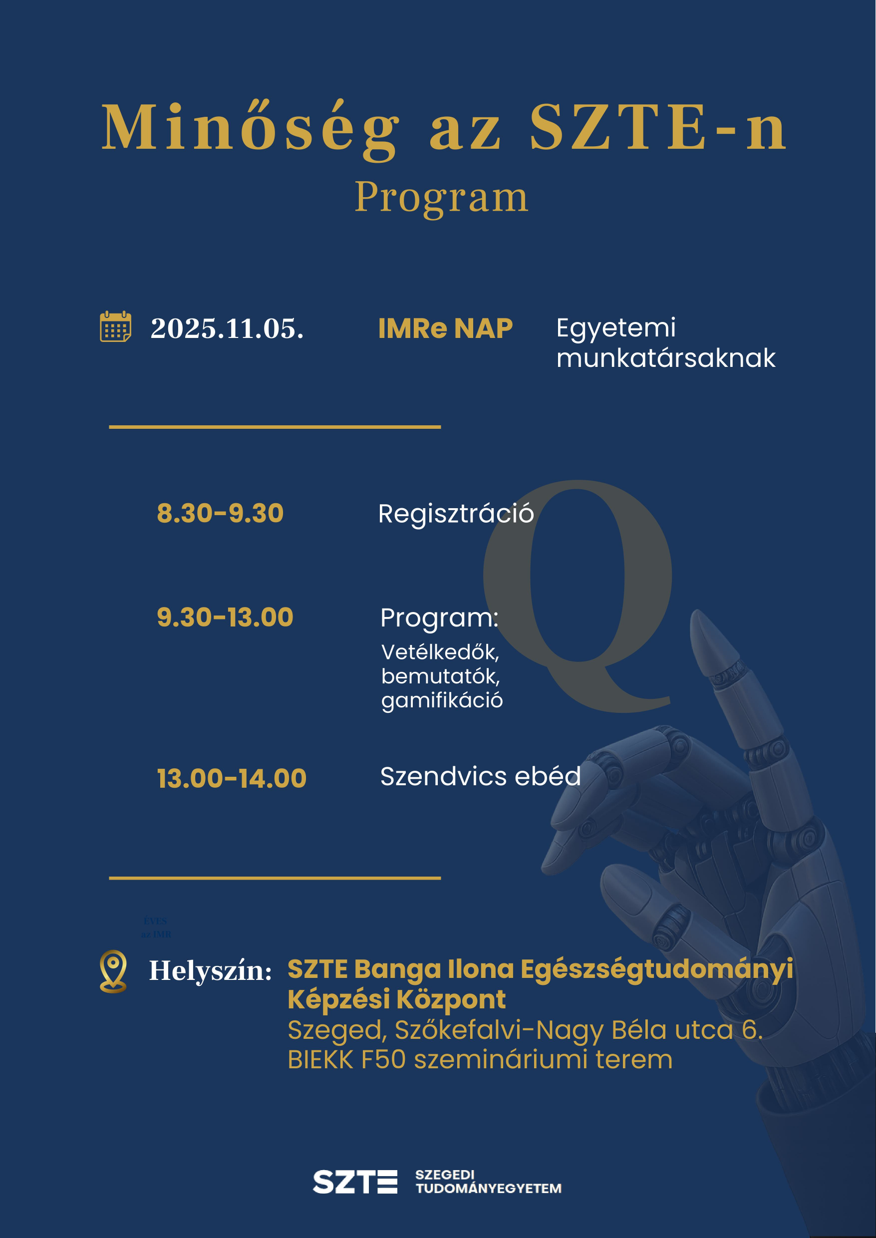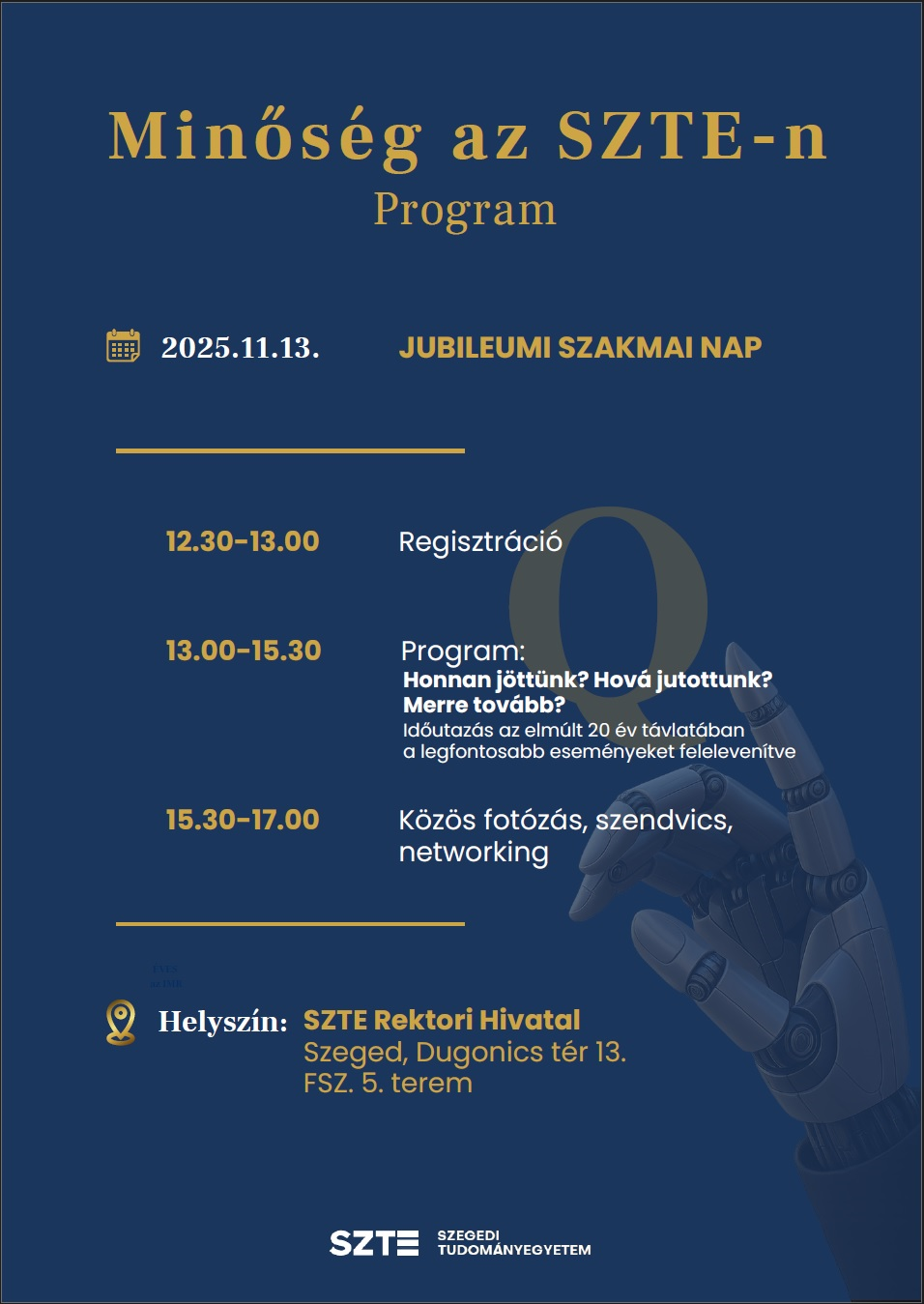 A Szegedi Tudományegyetem immár két évtizede a minőségirányítás, a tudásmegosztás és a fejlődés iránti elkötelezettséggel építi közösségét. A jubileumi eseménysorozat célja, hogy együtt idézzük fel eddigi eredményeinket, osszuk meg tapasztalatainkat és közösen keressünk válaszokat a jövő kihívásaira – mindezt a gamifikáció és az élményalapú tanulás eszközeivel gazdagítva.