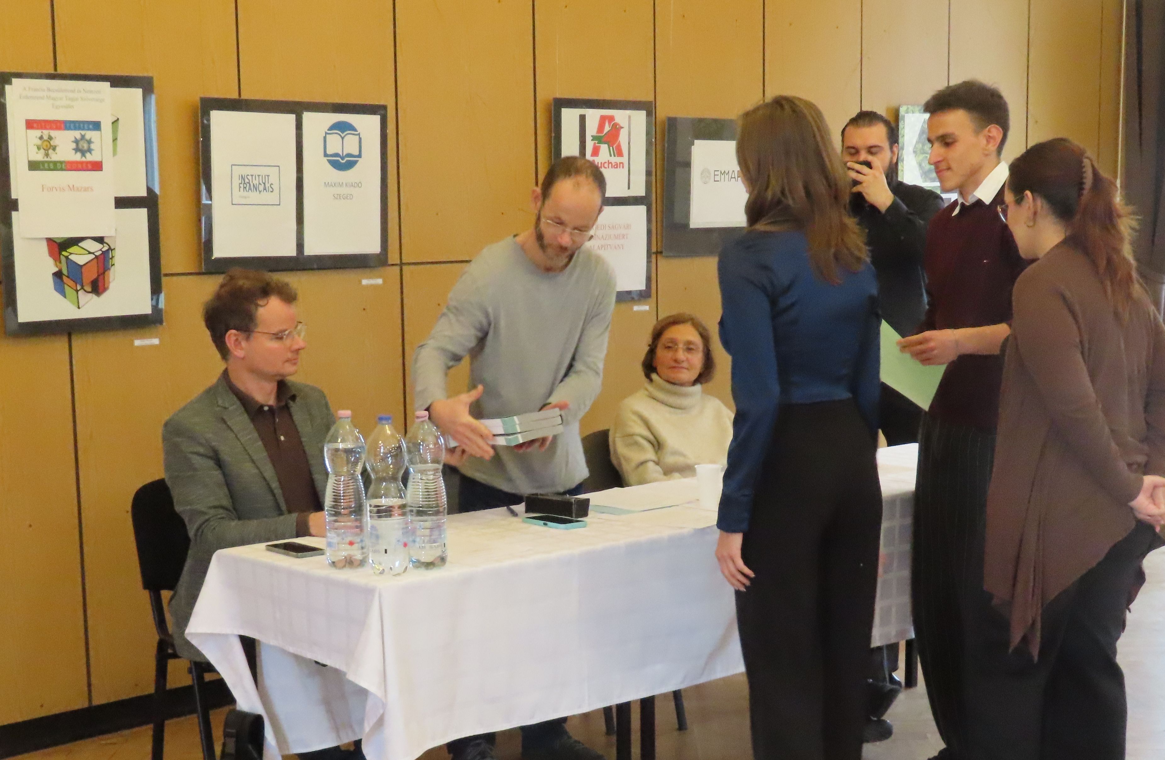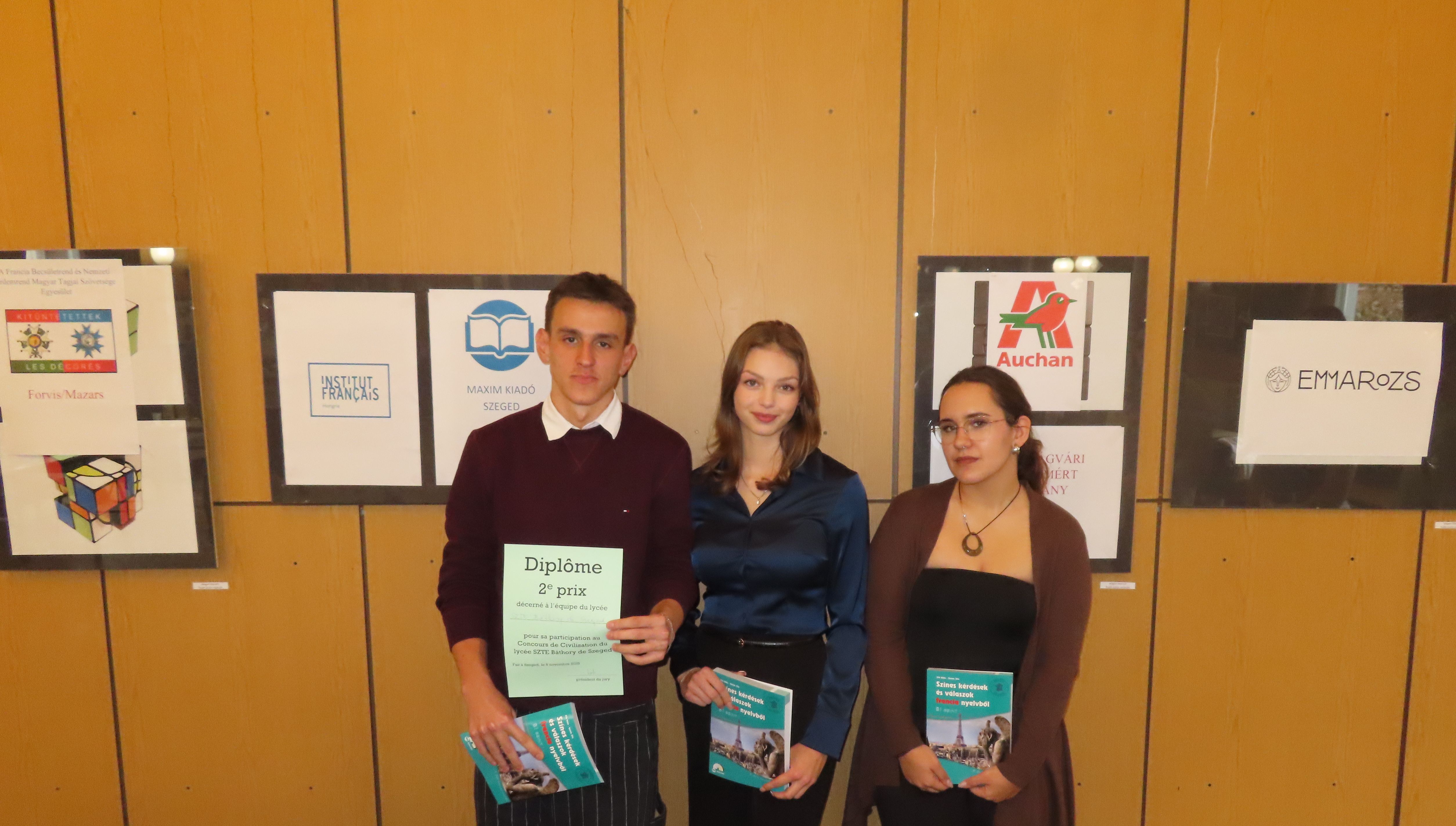 A zsűrit az egyetem elismert szakemberei alkották: az SZTE BTK Francia Tanszékéről dr. Farkas Ildikó szaktolmács, nyugalmazott egyetemi adjunktus, dr. Szász Géza egyetemi docens, valamint dr. Kruzslicz Péter, a Frankofón Egyetemi Központ igazgatója. A versenyen iskolánk 10. f osztályos csapata (Huszák Zsófia, Makra Mihály, Vigyikán Zóra) a 2. helyet szerezték meg (a csapat felkészítő tanárai: Filó Réka és László Györgyi). Ezentúl minden évben szeretnénk rendezni hasonló megmérettetést, bízva abban, hogy a versenyző diákok és kísérőik is ugyanolyan jól fogják érezni magukat, mint az idén.