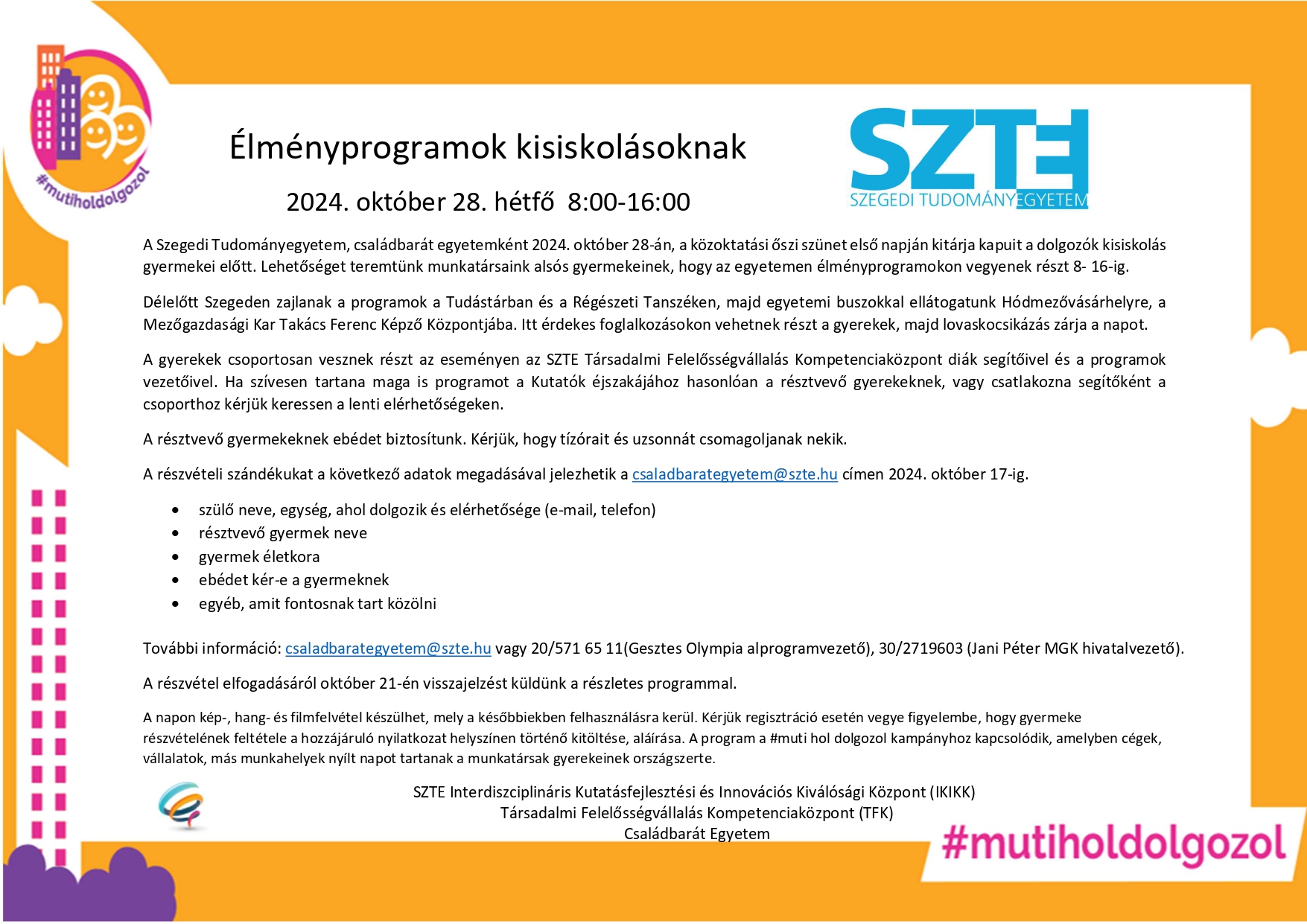 Az SZTE Családbarát Programjának keretében novemberben is színes közösségi és sporteseményekkel várjuk az egyetem munkatársait és családtagjaikat. Az Alma Mater mikulás és karácsonyi adománygyűjtés mellett különleges rendezvények, mint a Füvészkert Momiji ünnepe, a Film vs Könyv kvízdélután, illetve sportprogramok, köztük a Jégkorcsolyázás és Aerobik Maraton is hozzájárulnak a testi-lelki feltöltődéshez.