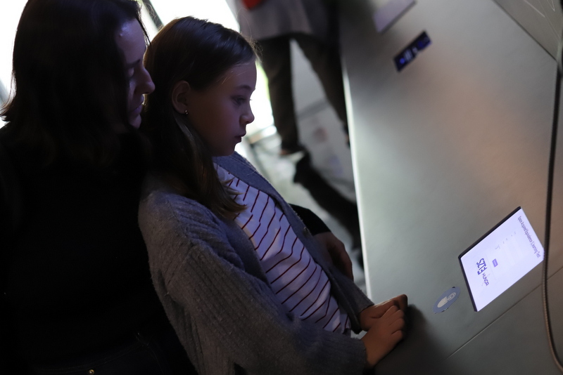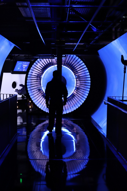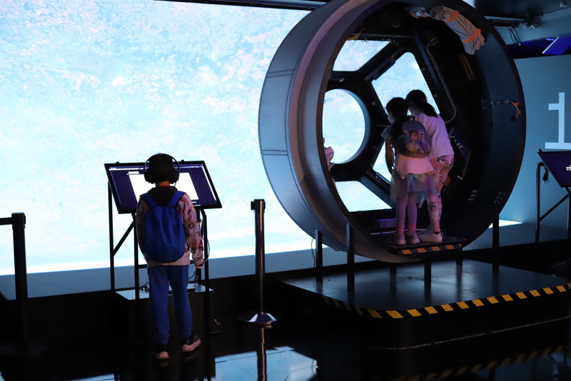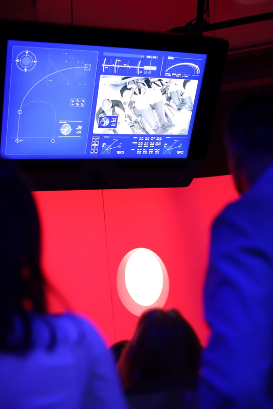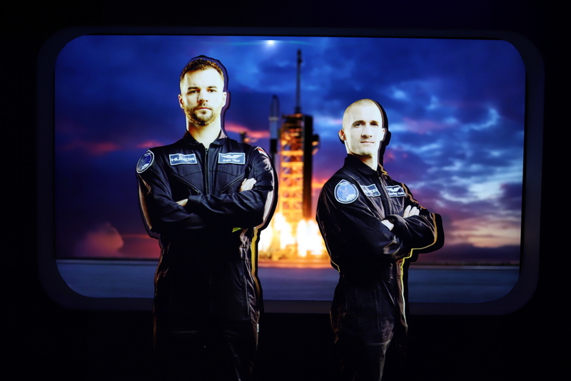 Az egyik folyosó végén hatalmas makett szemlélteti a SpaceX Falcon-9 rakéta hajtóművét, amely Föld körüli pályára állította a Crew Dragon űrhajót. Itt azt is kipróbálhattuk a megdöntött ülésekbe ülve, hogy milyen lehetett az űrhajóban átélni a felbocsátást.