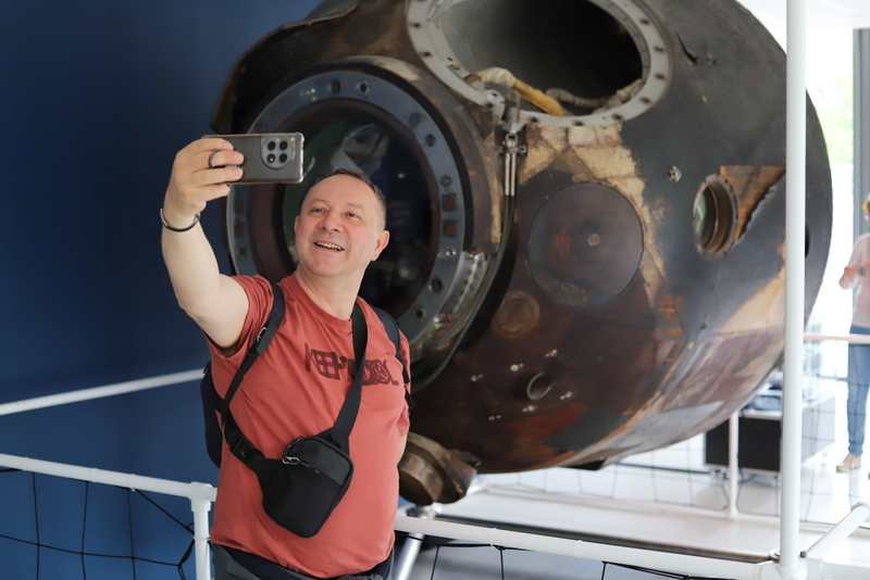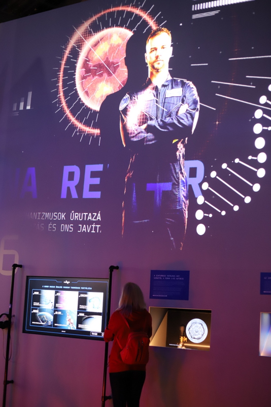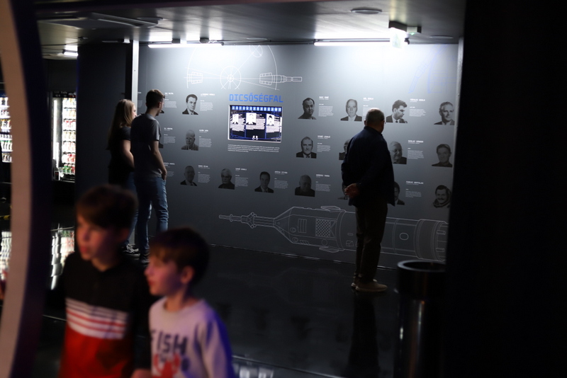 Kapu Tibor és Cserényi Gyula életnagyságú fotója és hangüzenete várt bennünket az emeleten. Fényképezkedtünk is velük, pontosabban életnagyságú másukkal! Majd betekintést kaptunk az űrhajóssá válás hosszú folyamatába. Megtudtuk: a HUNOR Magyar Űrhajós Program felhívására 247 érvényes pályázat érkezett, a 6 lépcsős kiválasztási folyamatot követően 4 űrhajós jelölt maradt, akik 1632 órát töltöttek alapkiképzéssel, háromszor annyit, mint amit az Európai Űrügynökség (ESA) hajt végre. Gyakorlati és elméleti tréningeken vettek részt, hogy testileg és szellemileg is felkészüljenek. Teljesítették a pilótaképzést, izolációs szimuláción vettek részt, miközben komoly pszichés terhelésnek voltak kitéve.