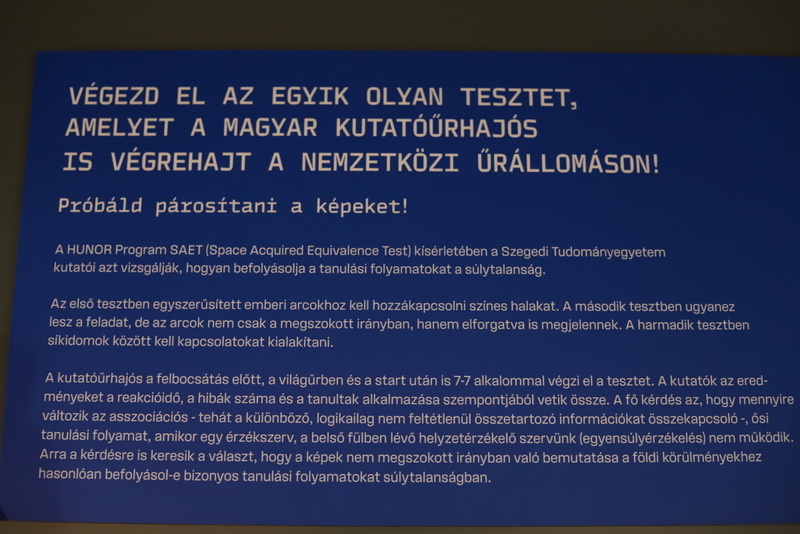 A kiállításon kipróbáltuk egy részleges gravitációt szimuláló futópad segítségével, hogy milyen érzés a súlytalanság! Láttuk a holdjáró autó makettjét, amelyet a magyar származású Pavlics Ferenc fejlesztett ki, a szintén magyar fejlesztésű Pille dózismérő másolatát, és azt a visszatérő kapszulát is, amelyben Farkas Bertalan visszaérkezett a Földre 1980. június 3-án. Hazatérését itthon hatalmas ünneplés övezte – utazása a nemzeti büszkeség jelképe lett. Most, hogy ismét magyar űrhajós tartózkodott a világűrben, izgatottan és büszkén vártuk hazatérését, hiszen történelmi pillanatok tanúi lehettünk újra.