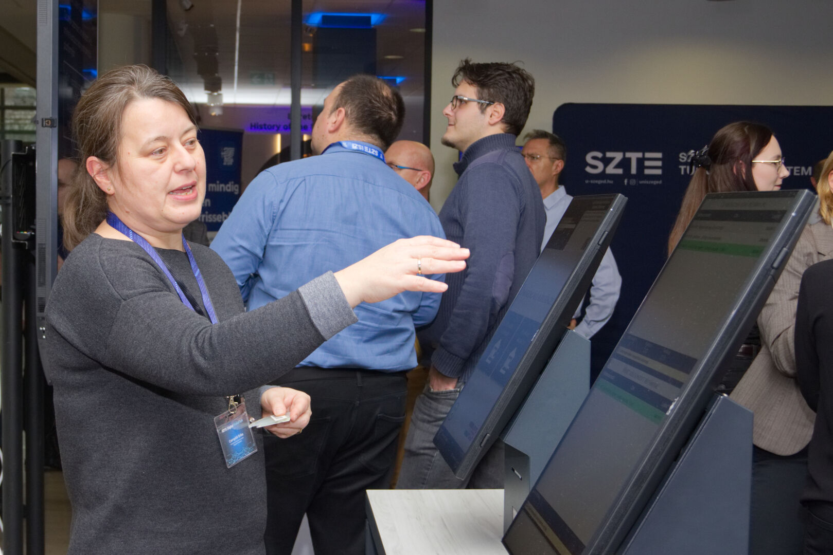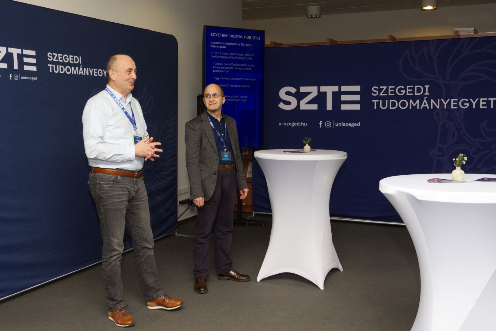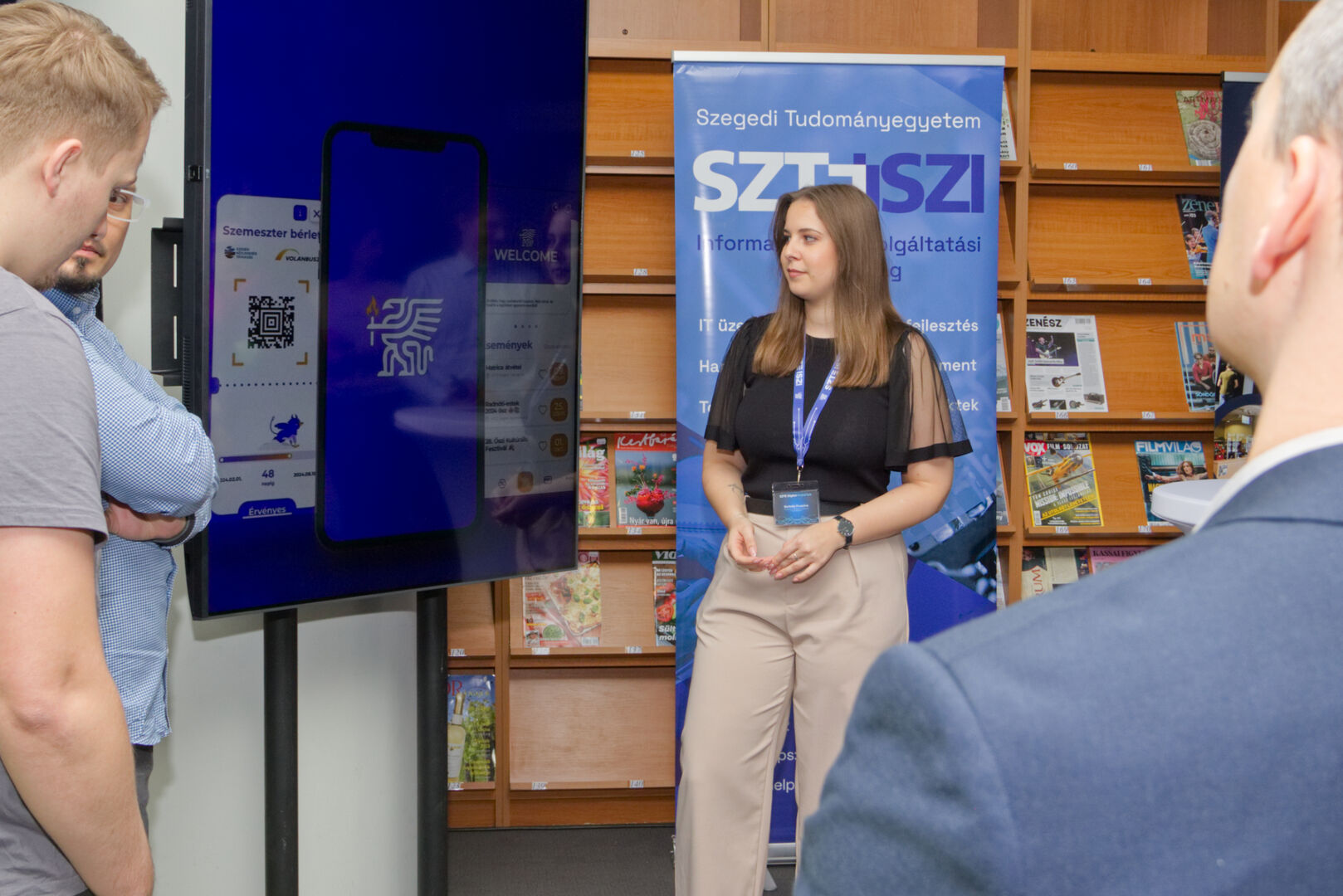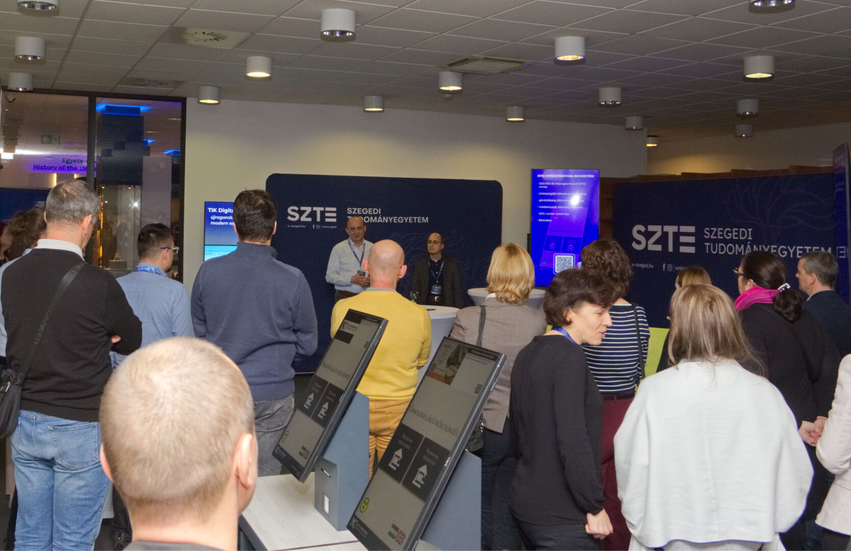 A Komplex digitális modellváltás – intelligens fokozatváltás projekt digitális fejlesztésekért felelős alprojektjének vezetője, Fekete Csaba, informatikai és szolgáltatási igazgató, valamint a projektben zajló könyvtárinformatikai fejlesztések felelőse, Dr. Nagy Gyula, a Klebelsberg Könyvtár és Levéltár főigazgatója közös eseményre invitálták az egyetem vezetőit és a projekt megvalósulását támogató munkatársakat decemberben. A programon digitális kijelzőkön és ledposztereken futó információs anyagok formájában, digitális kiállítással mutatták be az elmúlt időszak fejlesztéseit, amelyen a résztvevők a kiállítás megtekintése közben az egyes fejlesztési területek felelőseit kérdezhették kötetlen beszélgetések formájában.