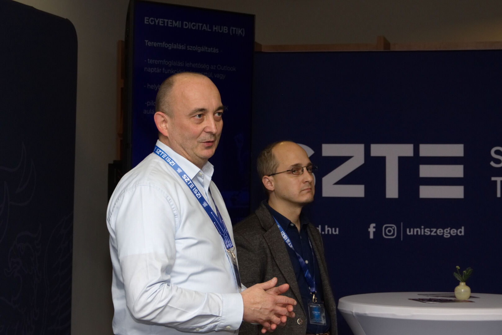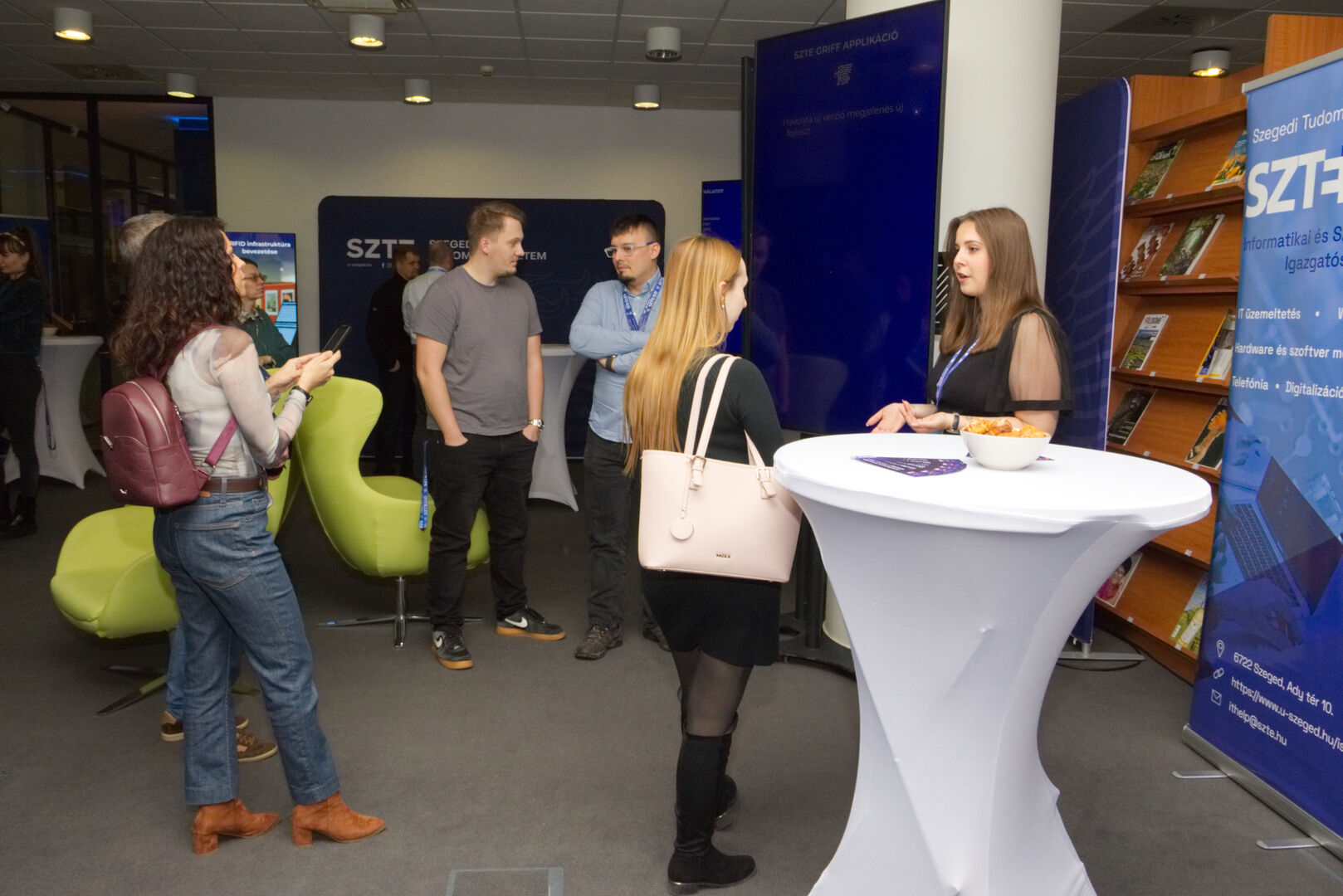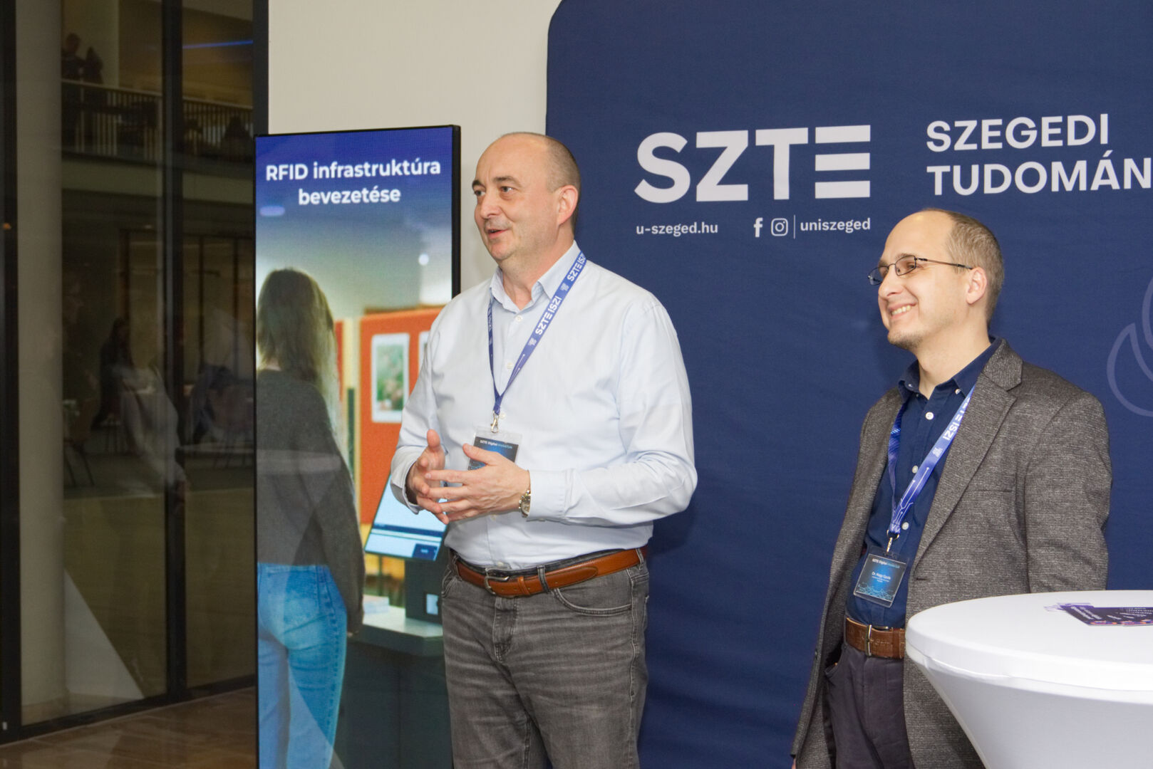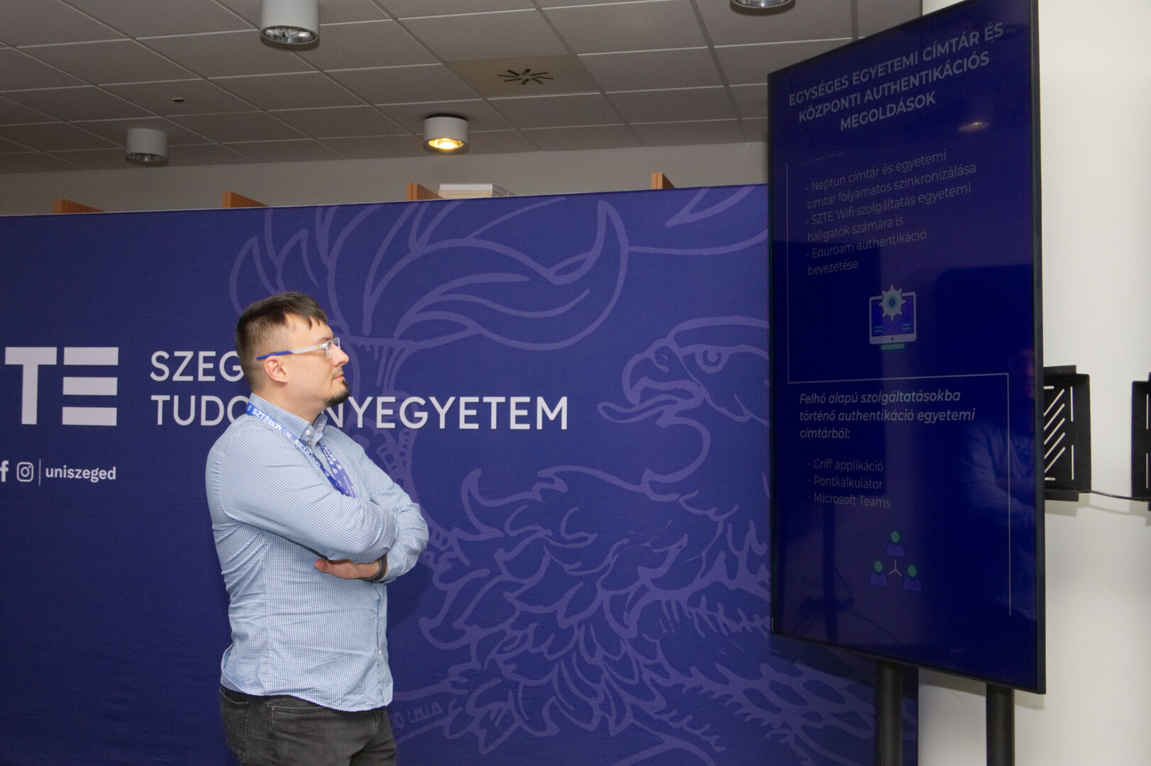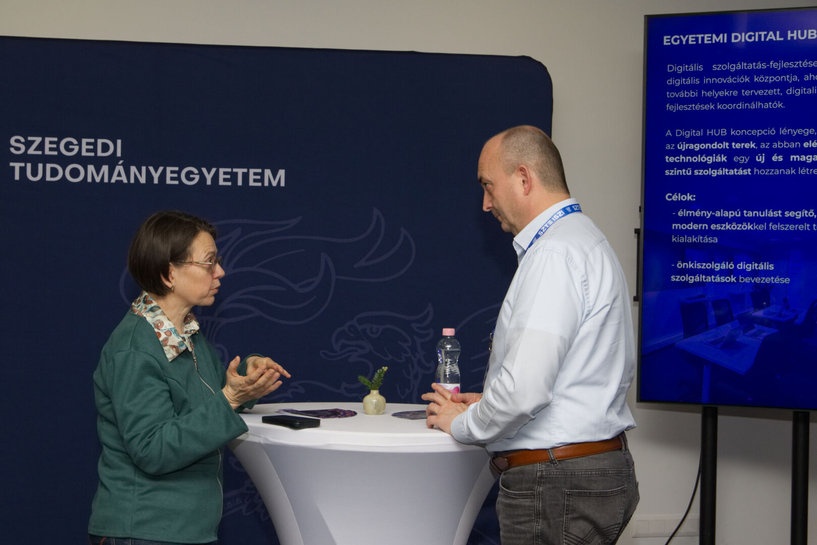 A Komplex digitális modellváltás – intelligens fokozatváltás projekt digitális fejlesztésekért felelős alprojektjének vezetője, Fekete Csaba, informatikai és szolgáltatási igazgató, valamint a projektben zajló könyvtárinformatikai fejlesztések felelőse, Dr. Nagy Gyula, a Klebelsberg Könyvtár és Levéltár főigazgatója közös eseményre invitálták az egyetem vezetőit és a projekt megvalósulását támogató munkatársakat decemberben. A programon digitális kijelzőkön és ledposztereken futó információs anyagok formájában, digitális kiállítással mutatták be az elmúlt időszak fejlesztéseit, amelyen a résztvevők a kiállítás megtekintése közben az egyes fejlesztési területek felelőseit kérdezhették kötetlen beszélgetések formájában.