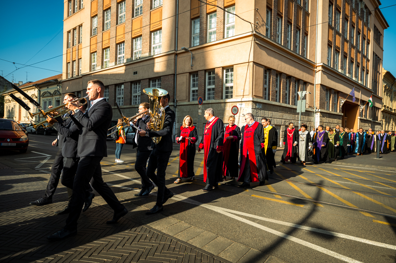 The University of Szeged opened the 2025–2026 academic year on Friday, September 5, with a ceremonial procession that set off from the Main Building on Dugonics Square and proceeded along an expanded route to the Study and Information Center (TIK). The professors marched under the university flag, alongside the European, Hungarian, and city flags, accompanied by a brass ensemble. The procession concluded with the participants gathering for a group photo in front of TIK.