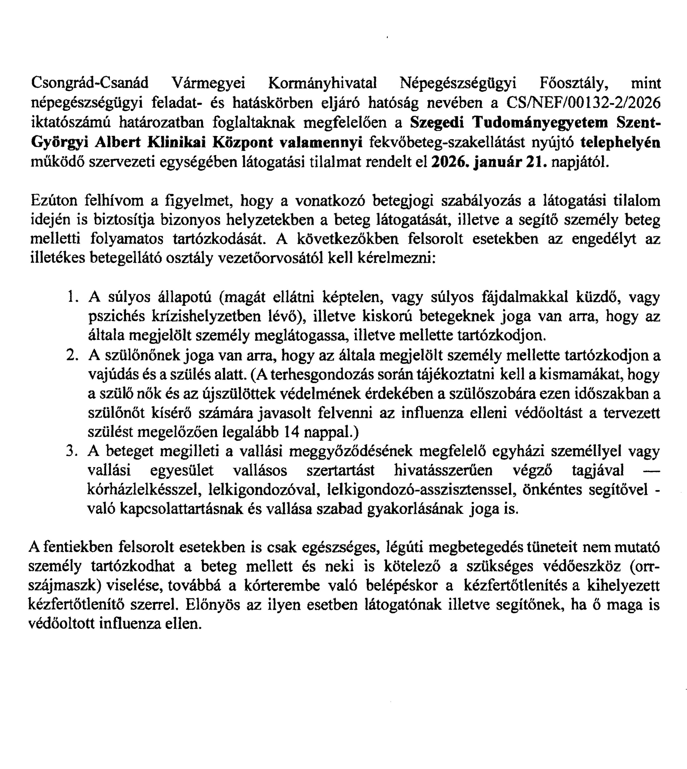 Speciális helyzetekben a betegek látogatás továbbra is biztosított.