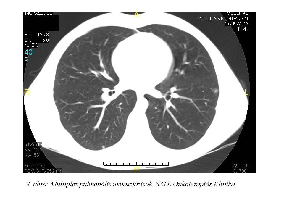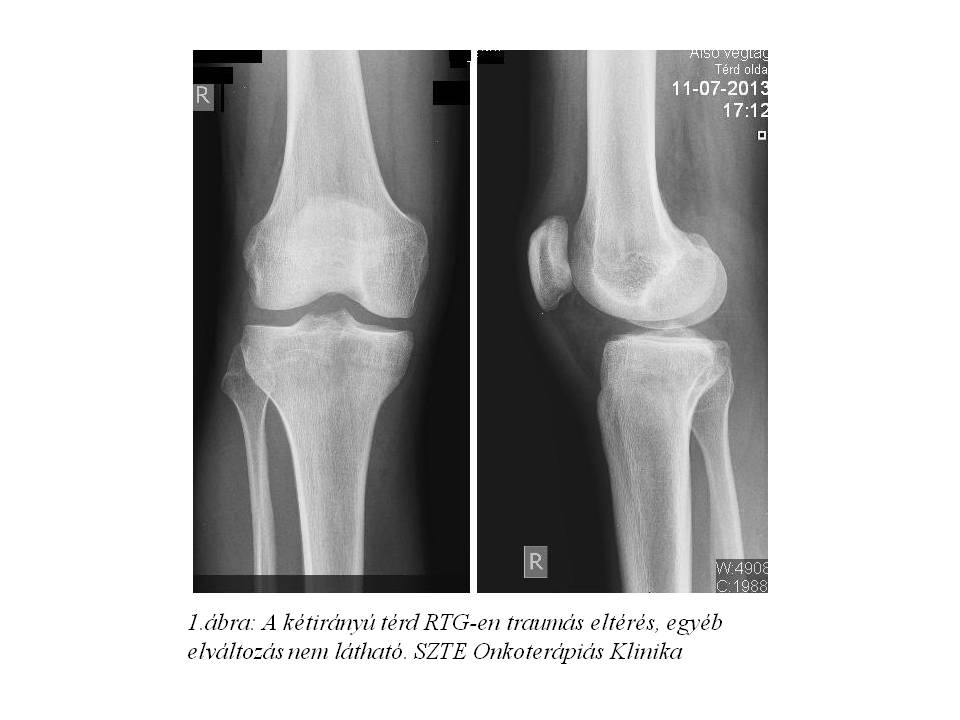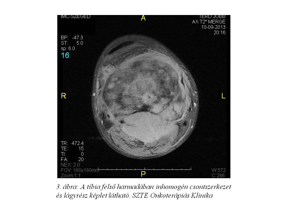 dolt. Júliusra a fájdalom fokozatosan erősödött, RTG vizsgálat (1. ábra) készült, mely traumás eltérést nem írt le, lokális Diprophos-Diclac terápia indult. Fájdalma nem mérséklődött, ellenben folyamatos dagadás és térdhajlati terime növekedést észlelt, MRI (2. ábra, 3. ábra) készült, mely alapján sürgős biopsia történt. A tibia biopsia szövettana desmoplastikus kis kereksejtes tumort (DSRCT) véleményezett, habár a tumor lokalizációja extrém ritka. A DSRCT agresszív, malignus tumor, kifejezetten rossz prognózissal (median túlélés: 17-25 hónap). Általában a primer tumor a hasüregben alakul ki, peritonealis terjedés az elsődleges, majd limfatikus és hematogén áttétképződés, különösen a májba. Staging vizsgálatai során disszeminált csontérintettséget, limfatikus és pulmonalis metasztázisokat írtak le (4. ábra, 5. ábra). A szakirodalom áttekintését követően 2013.10.14-én VIDE (Vincristine, Ifosfamide, Doxorubicin, Etoposide) kemoterápiás, ill. a disszeminált csontérintettség miatt zoledronsav kezelést kezdtünk. A felvételkor csak segédeszközzel, és igen nehezen mozgott, idejének több mint 50%-át ágyban töltötte, állandó medencefenék, keresztcsonti zsibbadásról, vizelet- és széklet-ürítési panaszokat említett.