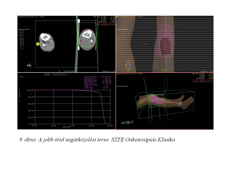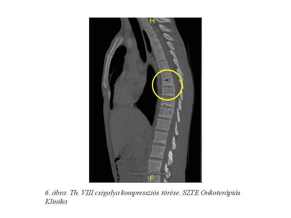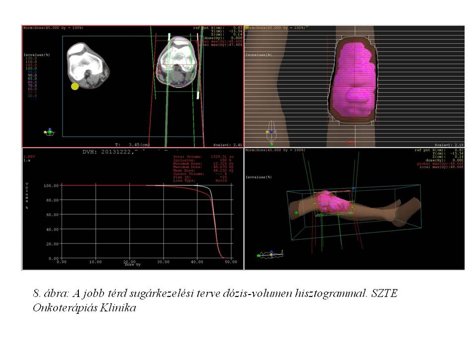 A második ciklust követően mozgása sokkal jobb lett, a felvételkor még ágyhoz kötött beteg, eddigre már önállóan, segédeszköz és kisérő nélkül, autóval is közlekedett. A jobb térd mérete az ellenoldalival megegyező, azonban a medencefenék zsibbadás és vizelet inkontinencia változatlanul fennállt. Re-staging CT leleteiben pulmonalis és limfatikus regressziót véleményeztek, azonban a Th. VIII-as csigolya kompressziós törését (6. ábra) írták le, az utóbbi miatt urgens radioterápiát indítottunk. A célterület a topometriás CT-n észlelt thoracalis, lumbalis és sacralis manifesztációk voltak, melyet a lokális kontroll érdekében a jobb térd sugárkezelésével egészítettünk ki, 2013.11.26-2014.01.20.-ig, 60 Gy összdózissal végeztük (7. ábra, 8. ábra, 9. ábra). A kezelés hatására klinikailag és a megismételt tervezési CT-n lényeges képi regressziót, javulást észleltünk.