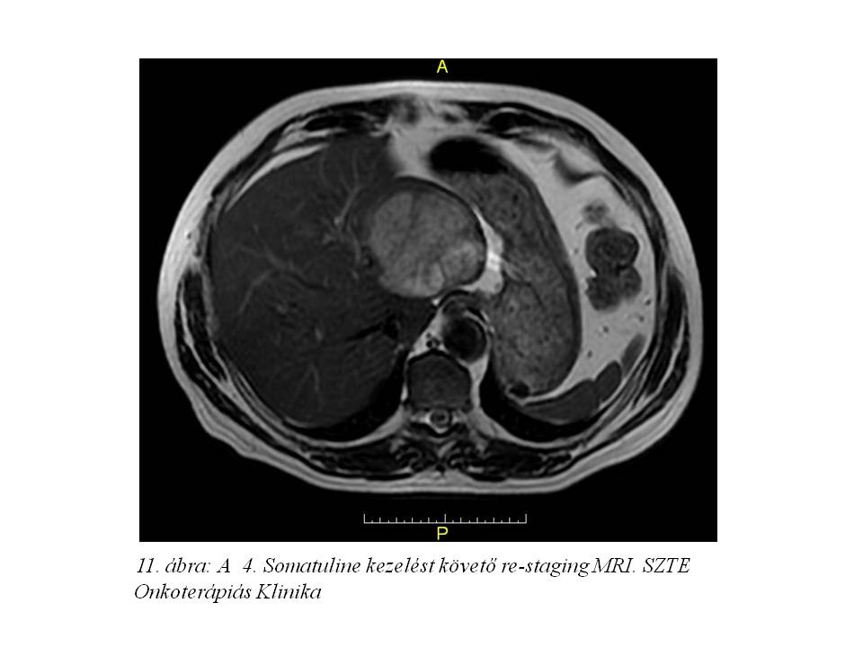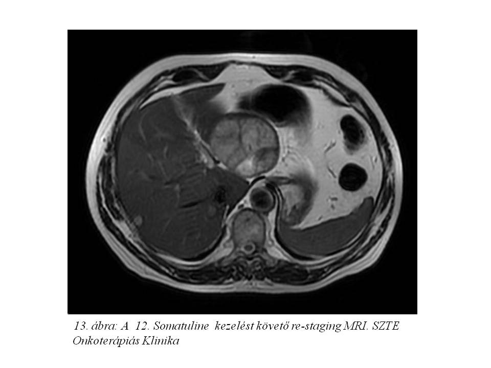 Ezt követően bőrgyógyászati ellátás vált szükségessé testszerte jelentkező viszkető urticaria miatt, felmerült octreotidra való túlérzékenység lehetősége. Emiatt kezelését a továbbiakban lanreotiddal (Somatuline) folytattuk, ugyancsak 4 ciklusonként végzett re-staging mellett. Jelenleg a hasi MR vizsgálaton (11. ábra, 12. ábra, 13. ábra) változatlan status látható, a chromogranin szint emelkedése mellett (266,9 – 310 – 427 ng/ml).