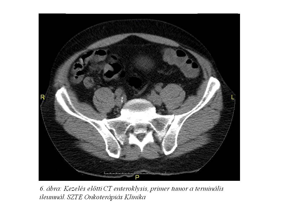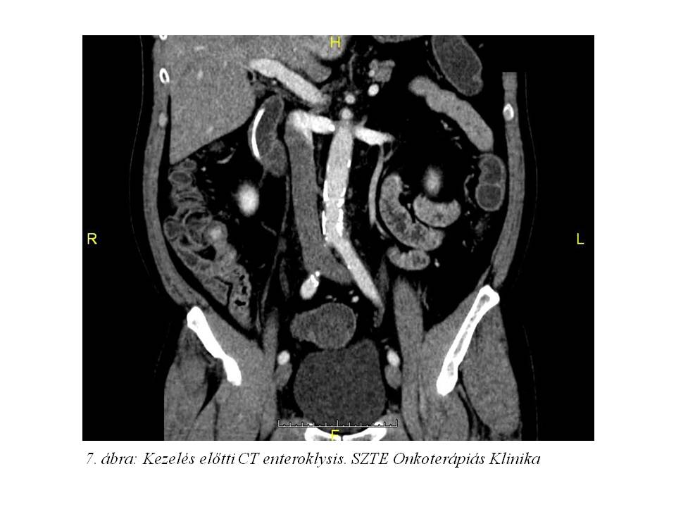 Tekintettel a diagnózis óta eltelt több hónapra re-staging hasi MR (4. ábra) és CT enteroklysis vizsgálat (5. ábra, 6. ábra, 7. ábra) történt. Az előbbi változatlan állapotot írt le, azonban az utóbbin a terminális ileum kezdeti szakaszán kb. 1,1x1,8x10 mm-es térszűkítő folyamat is ábrázolódott, mely megfelel a primer neuroendokrin tumornak.