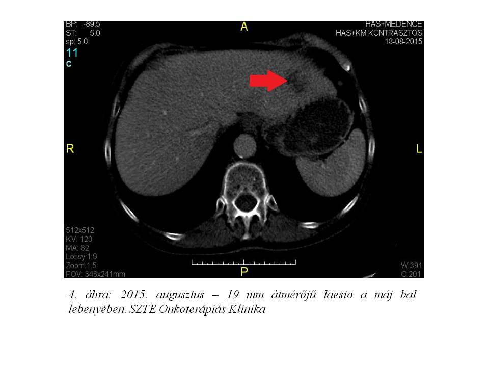 A radiológiai képalkotók által igazolt kifejezetten jó terápiás válasz mellett a beteg kezelése a korábban megkezdett dózisredukció mellett folytatódott tovább. Mindezek ellenére 2015 júliusában a soros kezelés megkezdése előtt elvégzett laborkontroll ismételten grade II. anaemiát jelzett, mely miatt ciklushalasztás vált szükségessé. 2015.06.30-án készült CT vizsgálatának leírásra szerint a májban korábban leírt gócok nem voltak elkülöníthetőek, azonban a beteg CA 19-9 szintje további emelkedést mutatott (175.2 U/ml).