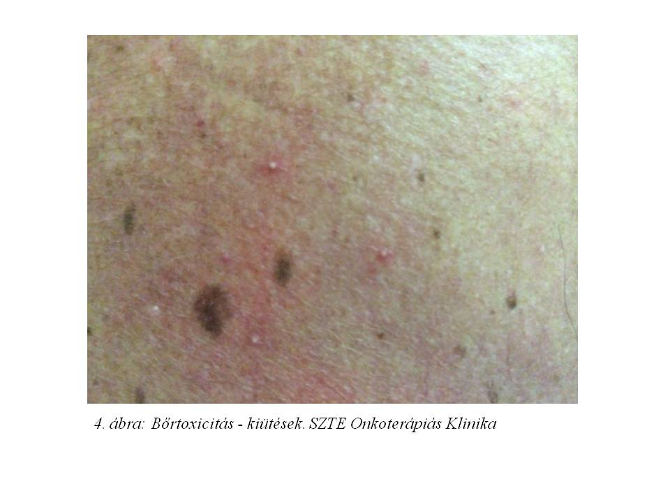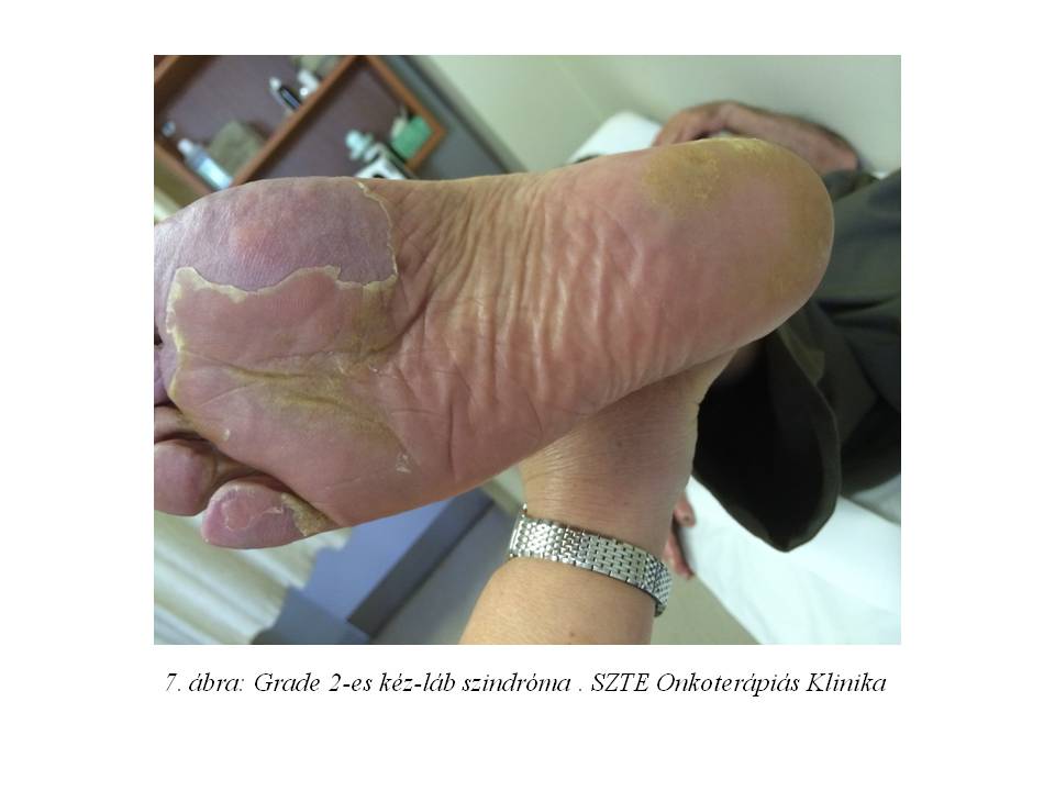 A kezelés mellékhatásaként grade 3-as kiütések (3. ábra, 4. ábra), grade 2-es sztomatitisz és grade 2-es kéz-láb szindróma (5. ábra, 6. ábra, 7. ábra) jelentkezett tenziókiugrás mellett, mely miatt 50 %-os dózisredukcióra kényszerültünk a vérnyomáscsökkentők beállítása és a bőrproblémák externákkal való kezelése mellett. A gondos betegvezetés és a család által támogatott jó compliance mellett a tenyerek, talpak hólyagos, nagyon kellemetlen elváltozása egyre későbbi kezelési héten jelentkezett, majd a 6. ciklusnál már nem is alakult ki.