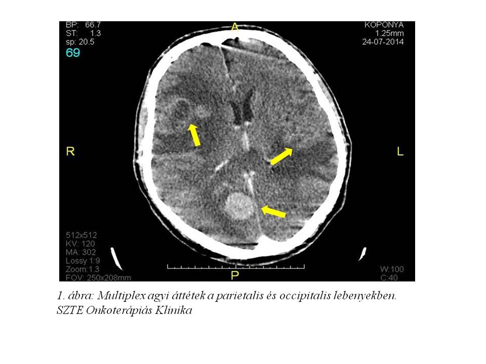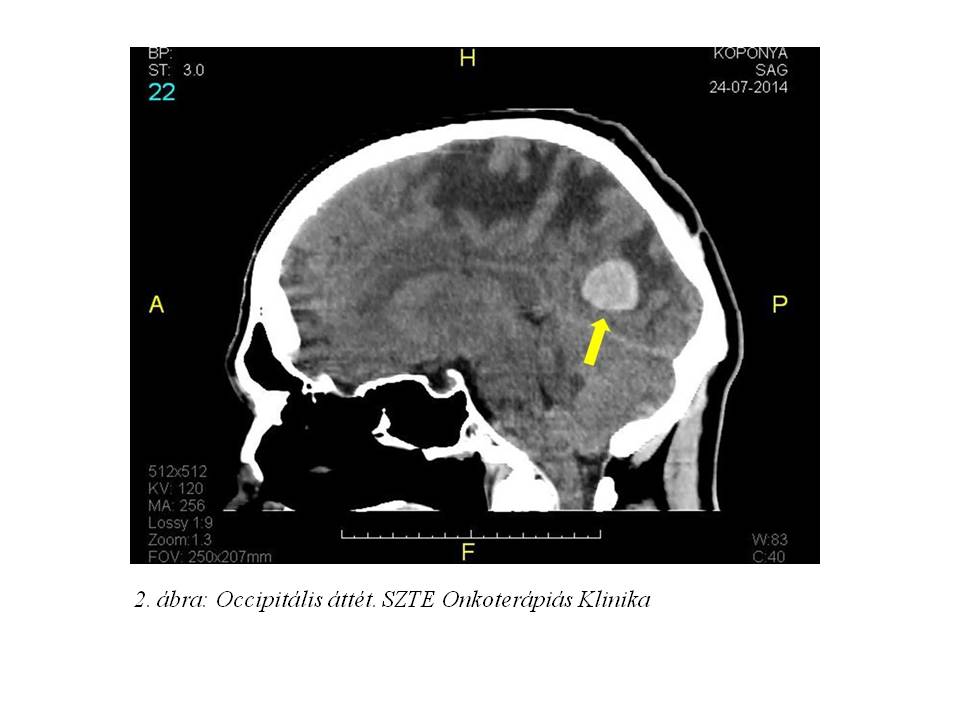 Egy 56 éves férfi betegünk kórtörténetét mutatom be, akit az SBO-ról vettünk át osztályunkra fejfájást, szédülést, hányingert és hányás okozó ismeretlen primer tumor multiplex agyi áttéteinek palliatív irradiaciójára (1. ábra, 2 ábra).