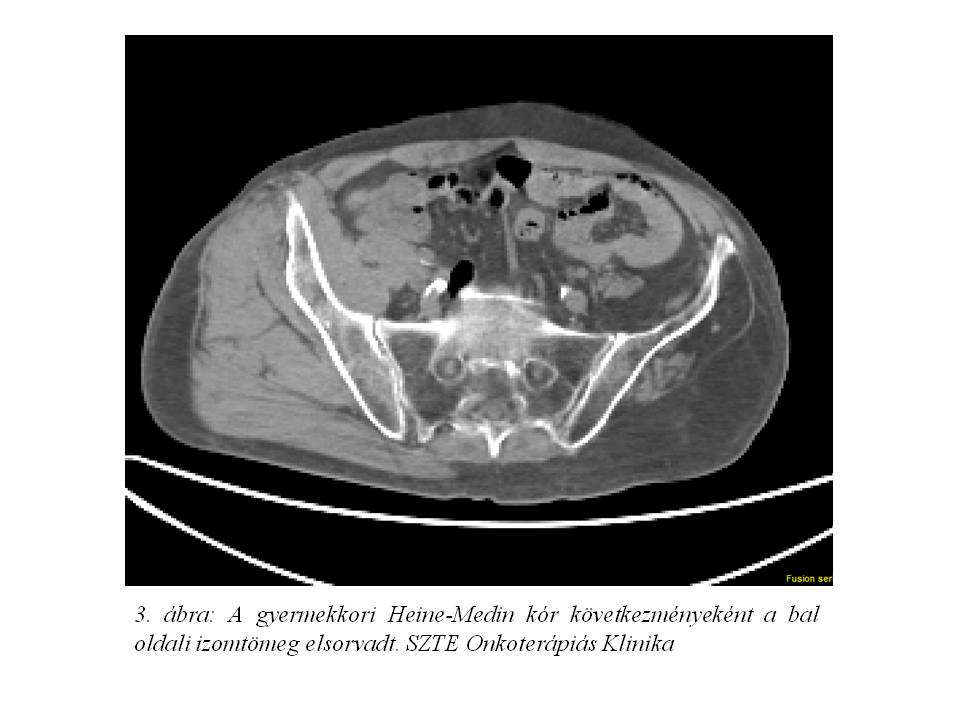 Kórtörténetéből a gyermekkori Heine-Medin kór (3. ábra) emelhető ki, mely miatt jelenleg is izomlazítót és alkalmanként fájdalomcsillapítót szed.