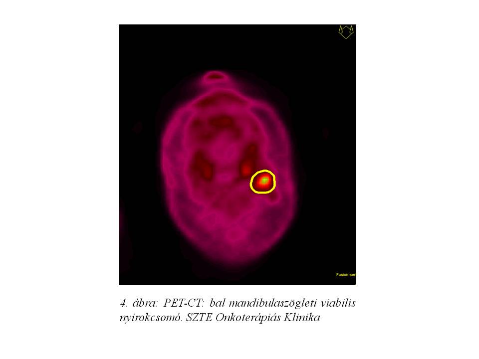 Mivel az agyi áttétek biopsziáját túl kockázatos beavatkozásnak ítéltük, kérelmet nyújtottunk be PET-CT vizsgálatra, mely primer tumort kimutatni szintén nem tudott, de malignitásra utaló radiofarmakon halmozásokat írt le több nyirokrégióban a rekesz mindkét oldalán. Ezek közül a bal mandibulaszögleti nyirokcsomó tűnt biopszia szempontjából a legkönnyebben megközelíthetőnek (4. ábra, 5. ábra).