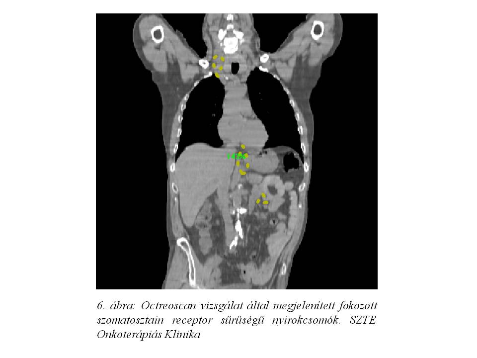 A szomatosztatin receptor szcintigráfiás vizsgálat primer eltérést szintén nem tudott elkülöníteni, de a felvételeket összevetve az FDG PET/CT vizsgálat során leírt nyirokcsomókkal, túlnyomórészt fokozott szomatosztatin receptor sűrűséggel rendelkező elváltozásokat írt le (6. ábra).