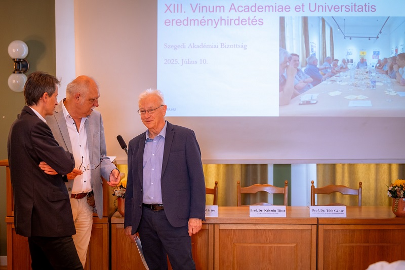 A „Vinum Academiae et Universitatis” borverseny eredményét 2025. július 10-én hirdették ki az MTA Szegedi Területi Bizottság székházában. A sajtótájékoztató kezdetén Vilmányi Márton, a SZAB titkára (balról); Tóth Gábor professzor emeritus, a borbírálat vezetője (középen); valamint Krisztin Tibor, a SZAB elnöke (jobbról) még egyeztetett a részletekről. Fotó: Kovács-Jerney Ádám