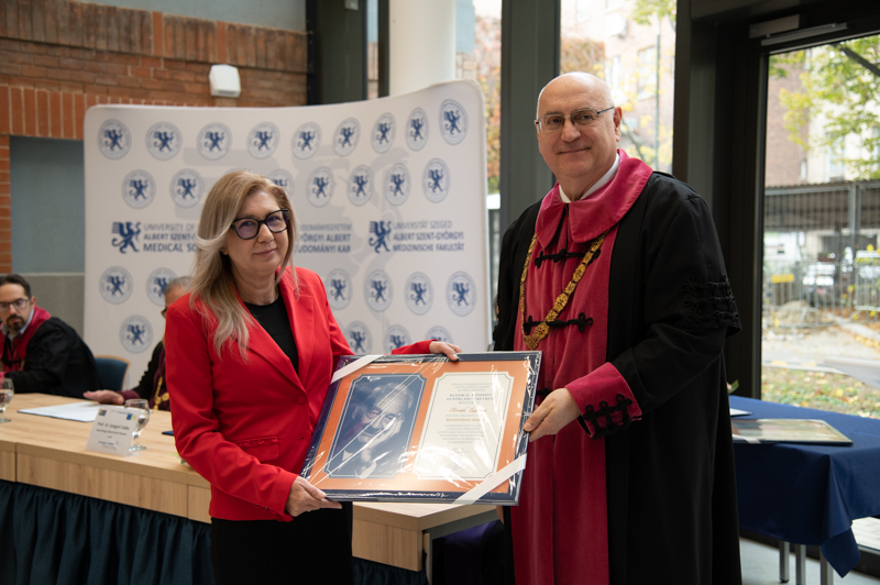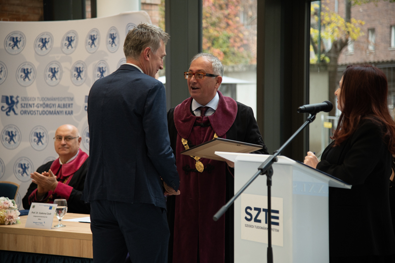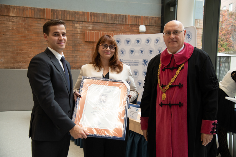 Beszédét követően Prof. Dr. Lengyel Csaba átadta a Szent Györgyi Albert Klinikai Központ specifikus elismeréseit, a nyugdíjba vonulók emlékérmeit, és a Címzetes Főorvosi Cím emléklapokat.