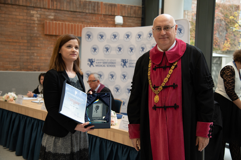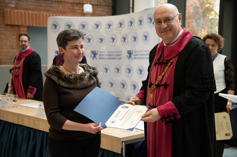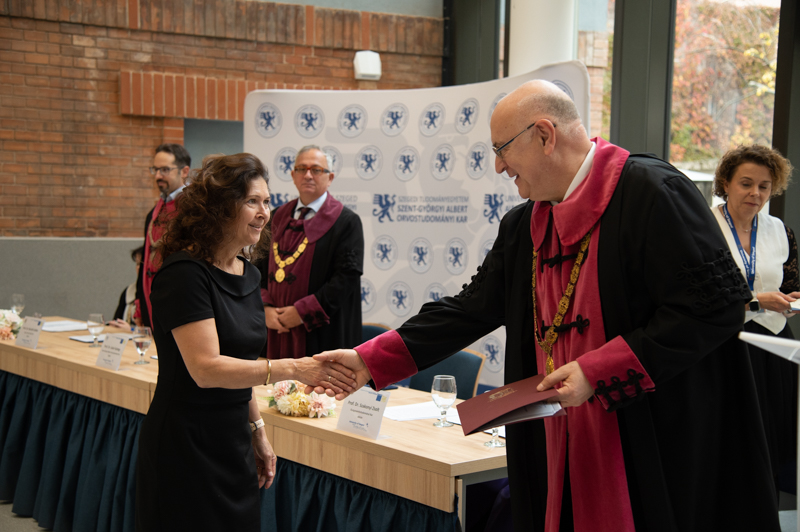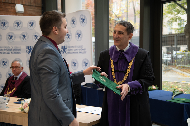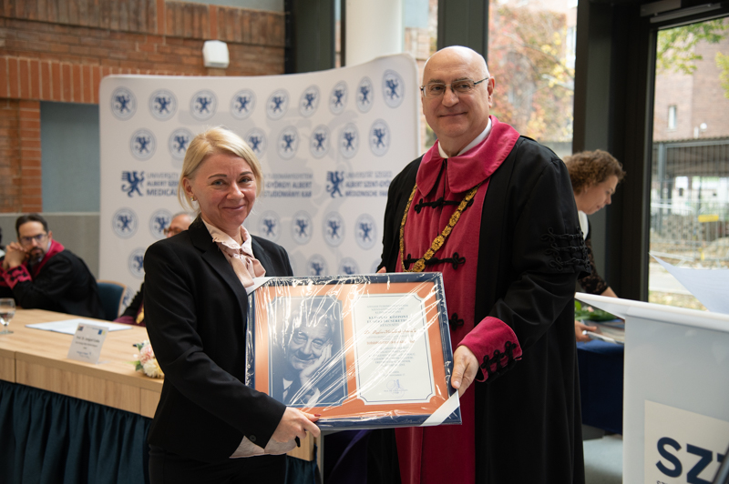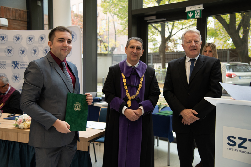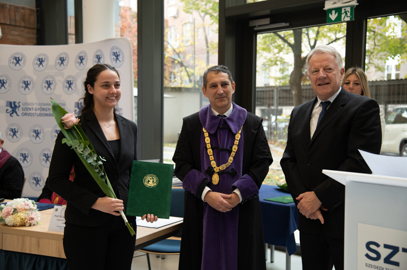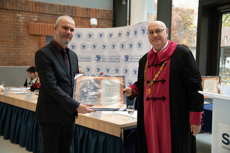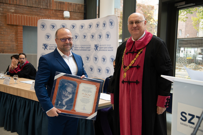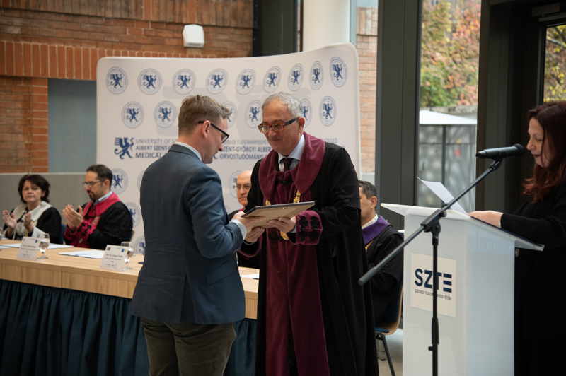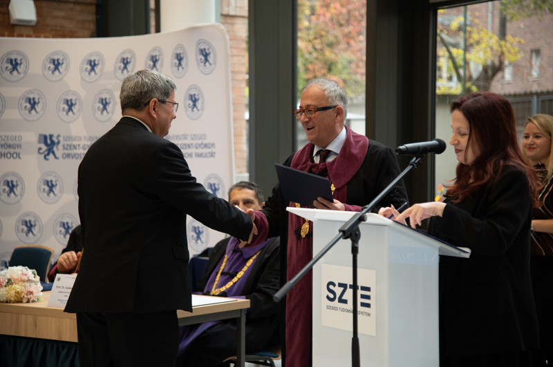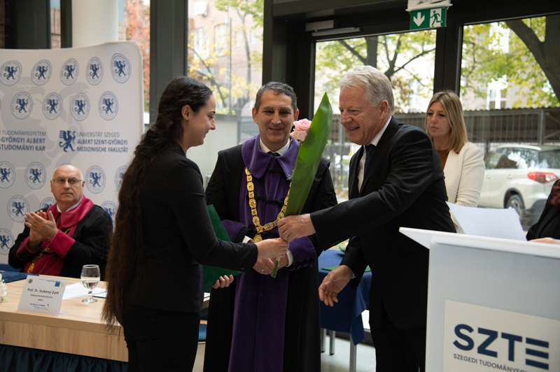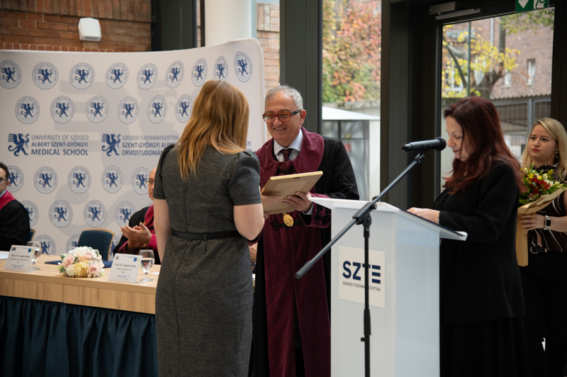 Beszédét követően Prof. Dr. Lázár György átadta a Szent-Györgyi Albert Orvostudományi Kar Tanácsának elismeréseit. A Tanács a „Kar Kiváló Tudományos Diákköri Oktatója” elismeréssel tüntette ki Dr. Molnár Tamást, a Belgyógyászati Klinika egyetemi tanárát és Dr. Zombori Tamást, a Pathológiai Intézet egyetemi adjunktusát. A „Kar Kiváló Oktatója” címet Dr. Kovács Ildikónak, a Pszichiátriai Klinika egyetemi adjunktusának adományozta. „Címzetes egyetemi docens” elismerő címet nyert el Dr. Szőke Tamás, a Regensburg-i Irgalmasrendi Kórház Mellkassebészeti Klinikájának osztályvezető-helyettese.