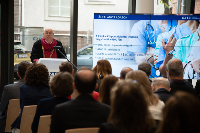 Felidézte azokat az eredményeket és sikereket, amelyek tovább öregbítik a Szegedi Tudományegyetem országos és nemzetközi hírnevét. A több mint 1,2 millió fős lakosság ellátása a 38 telephelyen megközelítőleg 1650 aktív, 130 krónikus és 220 rehabilitációs ágyon történik. Az éves fekvőbeteg-ellátás esetszáma eddig 110 ezer fölötti. A járóbeteg szakellátást tekintve – diagnosztikával, fogászati ellátással együtt – a szervezeti egységek száma közel 600, a heti szakorvosi óraszám 11 ezer fölötti, a heti nem szakorvosi óraszám meghaladja a 2000-et. Az éves játóbeteg-ellátás esetszáma megközelíti a 3 milliót, a beavatkozások száma pedig 16,5 millió. A Klinikai Központ dolgozói létszáma közel 6300 fő, amelyből 1500 fő orvos és egyéb diplomás, csaknem 4160 fő szakdolgozó, 260 fő egyéb egészségügyi szolgálati jogviszony törvény szerint dolgozó és majdnem 370 fő az egészségügyben dolgozó. Ez egy kisváros lakosságának felel meg.