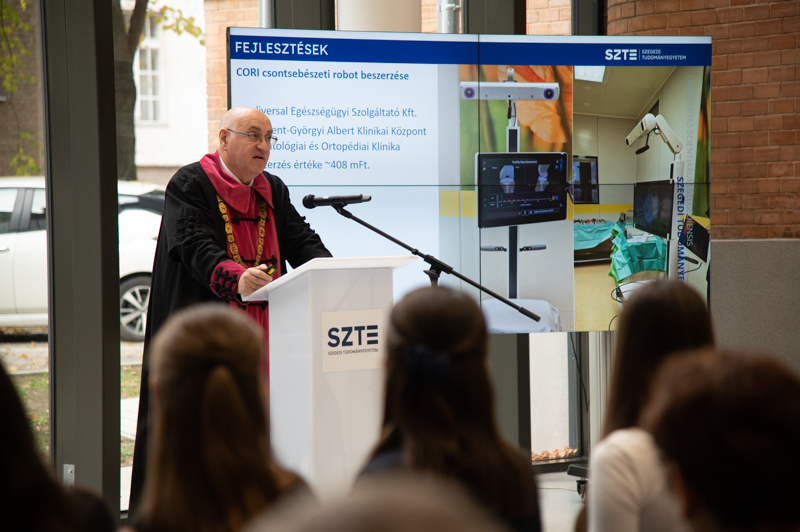 Az elmúlt egy évben számos fejlesztés valósult meg a Klinikai Központban. A Belgyógyászati Klinika Kardiológiai Centrumába például 2025 első félévében egy szívkatéteres angiográf berendezés érkezett 265 millió forint értékben, egy echokardiográfiás felső kategóriás ultrahang 28 millió forint értékben. 2025 februárjában megtörtént a Szülészeti és Nőgyógyászati Klinika Reprodukciós Medicina Intézet Andrológiai Ambulanciájának és laborjának kialakítása, felújítása saját forrásból, megközelítőleg 28 millió forint értékben. A koraszülött mentési feladatok átvételére és integrálására került sor az SZTE egészségügyi struktúrájába 2025. március 1-jével. Az egyetem regionális ellátórendszerben betöltött szerepe erősödött, miközben a humán, infrastrukturális és szakmai kapacitások is bővültek. A Mediversal Egészségügyi Szolgáltató Kft. az SZTE SZAKK Traumatológiai és Ortopédiai Klinikájával közös használatra 2025 májusában közfinanszírozott és térítéses betegellátásra beszerzett egy CORI csontsebészeti robotot, amely térd- és csípőprotézis műtétek kiszolgálására alkalmas. A berendezés értéke 408 millió forint. Az Ápolásvezetési és Szakdolgozói Oktatási Igazgatóság Központi Gyógytornász és Fizioterápiás Szolgálat részére oktatást támogató, fejlett technológián alapuló eszközöket szereztek be NKFI alapból 740 millió forint értékben. A Gyermekgyógyászati Klinika és Gyermekegészségügyi Központban a sebészeti és gyermektraumatológiai műtőblokkot újították fel 970 millió forint értékben, ahol néhány napja történt meg a műszaki átadás, továbbá 310 millió forint értékben (EFOP pályázati forrásból) a sürgősségi osztály felújítása is zajlik, november végén megtörténik a műszaki átadás.