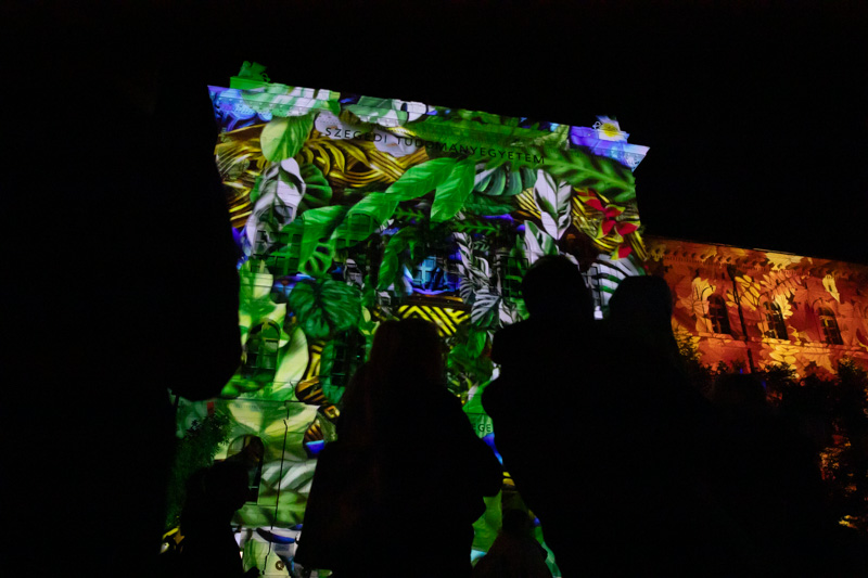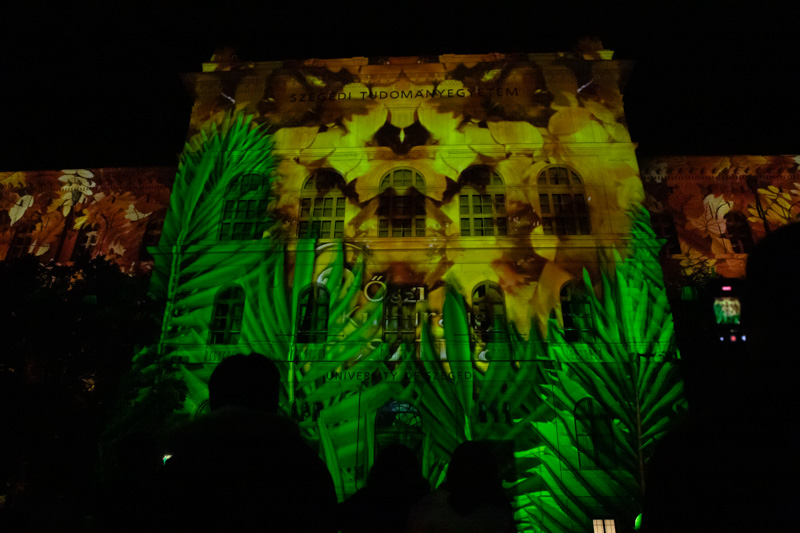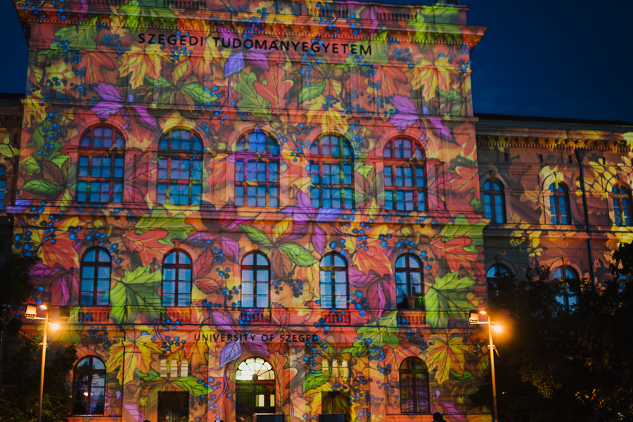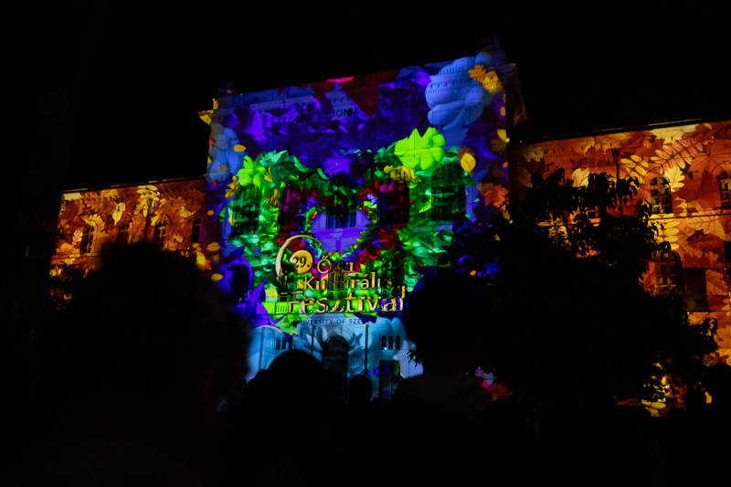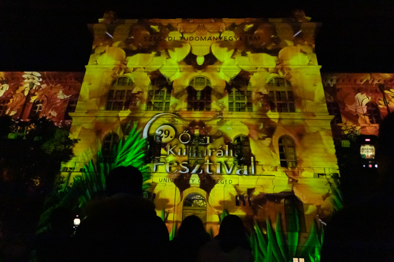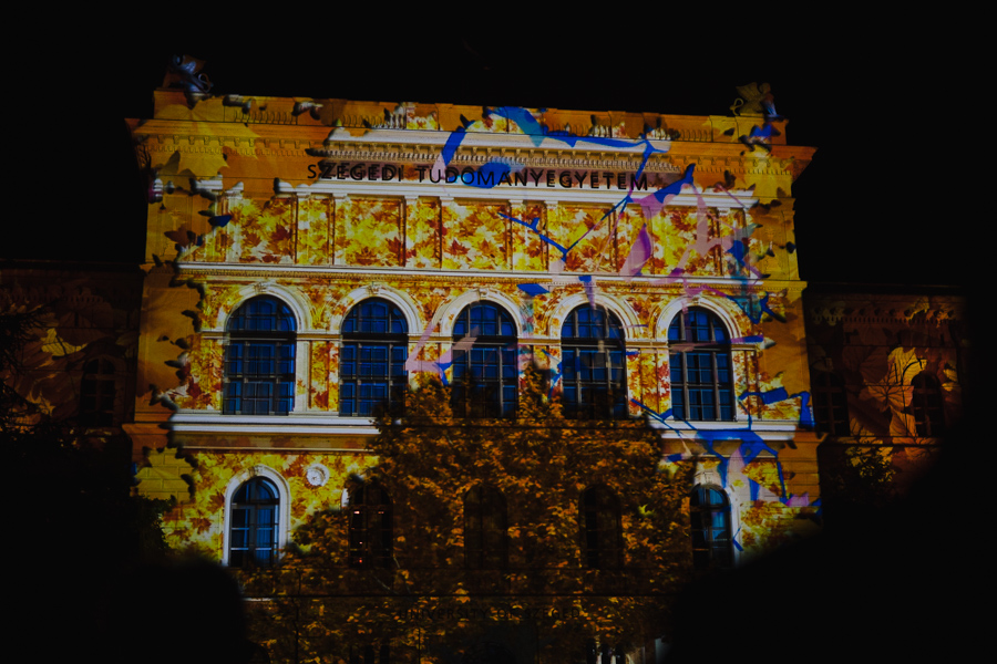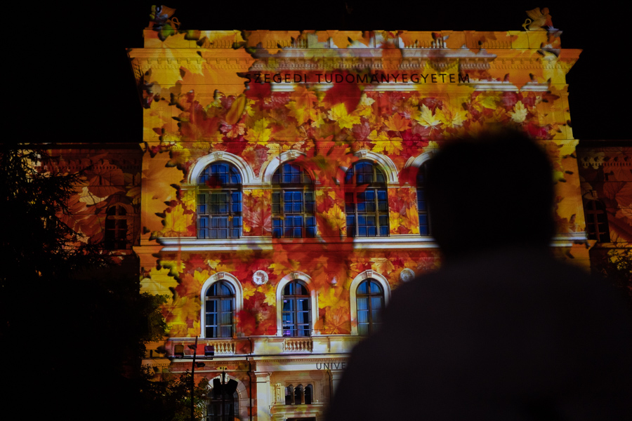 Az Őszi Kulturális Fesztivál megnyitójának immár hagyományos záróakkordjaként látványos fényfestéssel kedveskedtek a szervezők az érdeklődőknek. A Rektori Hivatal épülete félórán keresztül csodálatos színekben pompázott, miközben a Szegedi Nemzeti Színház művészei -Bánvölgyi Tamás, Csorba Kata, Krausz Gergő, László Gáspár, Polák Ferenc, Poroszlay Kristóf és Sziládi Hajna - A dzsungel könyve musical dalaiból énekeltek egy válogatást.