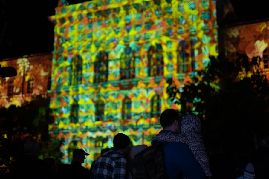 | Fényfestés a rektori épület előtt. Fotók: Kovács Anita és Gábor Amarilla |