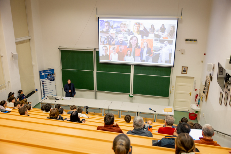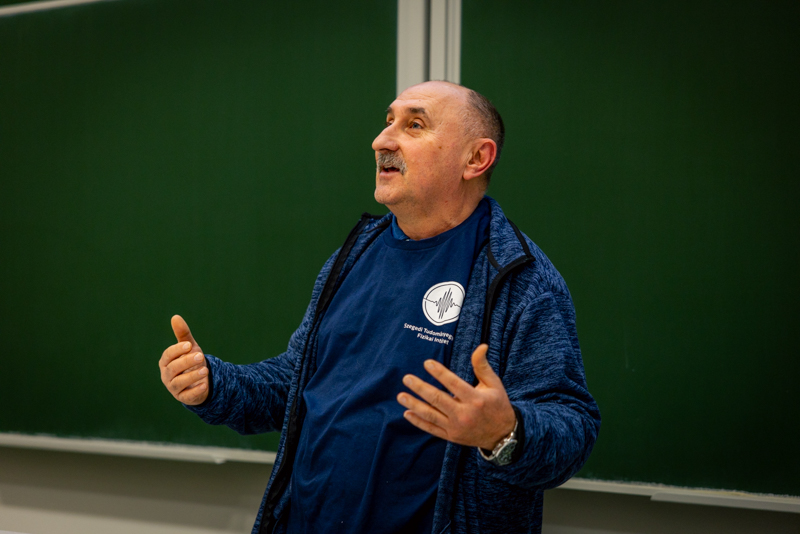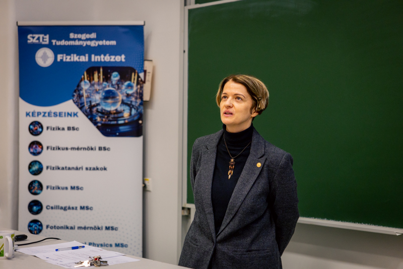 Fotonok, műszerek, mérések – a laboratóriumoktól a világűrig címmel tartott előadást a nyitóeseményen Dr. Szalai Tamás egyetemi adjunktus. Egy tablóképen olyan kollégákat mutatott be, akik a Szegedi Tudományegyetemen végeztek, s innen jutottak el például az Arizonai Egyetemre, az MIT-re (Massachusettsi Műszaki Egyetem), Berlinbe, illetve a hozzánk közeli, de rangos munkahelyekre, mint az ELI-ALPS Lézeres Kutatóközpont vagy a Semilab Zrt. Mint mondta, a tehetséggondozó program fő célja, hogy mindenki belekóstolhasson abba, milyen izgalmakat rejt a fizika és a természettudomány, és ő maga mihez érez ambíciót, miben tudná leginkább kibontakoztatni tudását. Dr. Szalai Tamás számos érdekességet árult el a James Webb űrtávcsőről, ami már több mint négy éve van a világűrben és gyűjti az adatokat. Érdekesség, hogy Szegedről jelenleg több mint huszonöt mérési programban vesznek részt a kutatók.