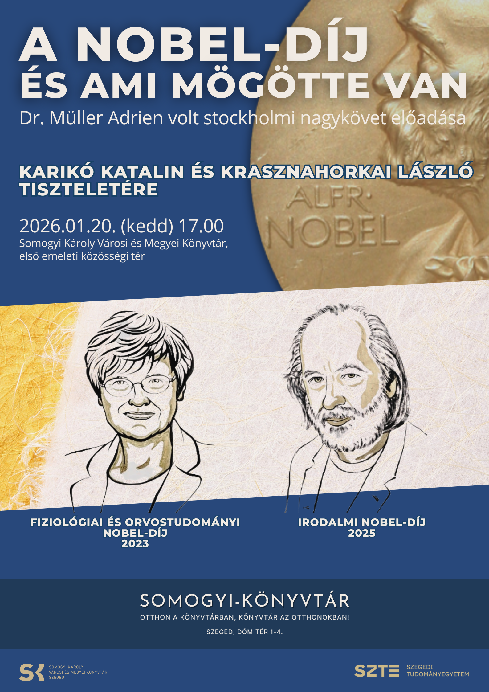 Januárban ünnepeljük az SZTE, korábbi nevén JATE két volt hallgatójának, két magyar Nobel-díjasnak a születésnapját. Ebből az alkalomból az 1954. január 5-én született Krasznahorkai László és az 1955. január 17-én született Karikó Katalin tiszteletére Dr. Müller Adrien, Magyarország volt svédországi nagykövete – aki nem mellesleg szintén a JATE volt joghallgatója – tart előadást A Nobel-díj és ami mögötte van címmel 2026. január 20-án 17 órától, a Somogyi-könyvtárban.