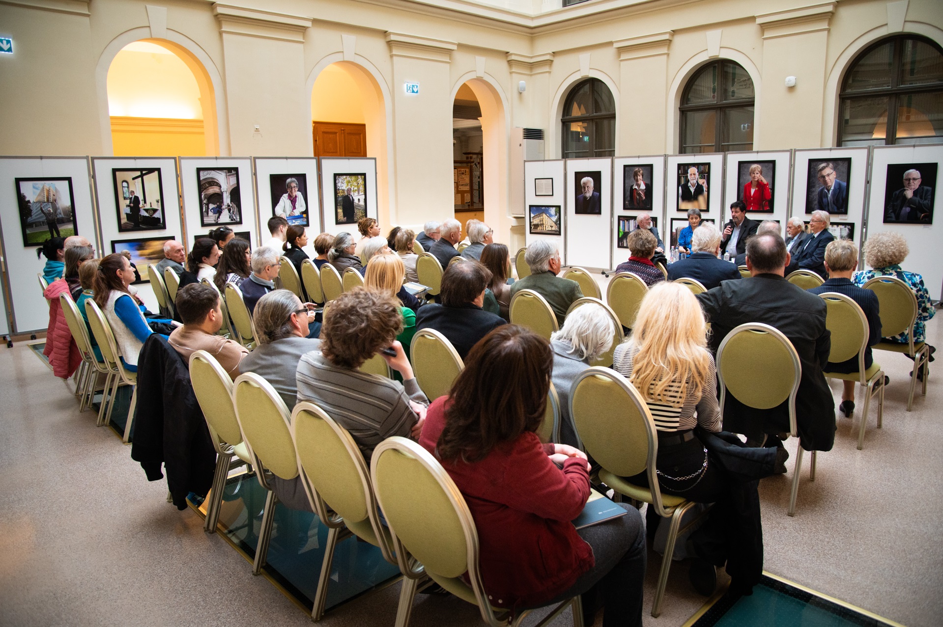 A „szegediakadémikusok 4 dimenzióban” című albumot és az azt reprezentáló fotókiállítást bemutató beszélgetés résztvevői – balról jobbra –: a kötet szerzői képviseletében Dusha Béla fotóművész; a kötet és tárlat főszereplői, az akadémikusok képviseletében: Németh T. Enikő nyelvész. A kérdező szerepében Márok Tamás újságíró. Az akadémikusok közül: Venetianer Pál biokémikus és Krisztin Tibor matematikus, az MTA Szegedi Akadémiai Bizottság elnöke. Fotó: Bartha Karina